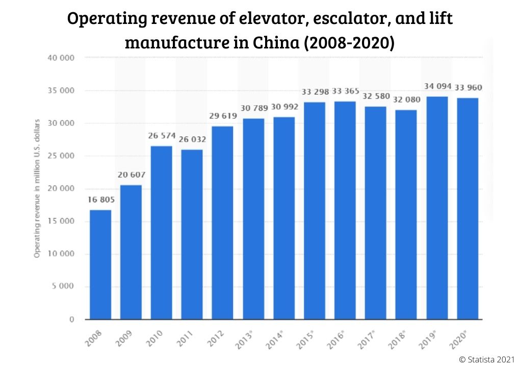 In fact, if we look at the operating revenues of elevator, escalator, and lift manufacture in China, they have reached approximately 33.36 billion U.S. dollars in 2020 and this market is expected to grow even more after the Covid-19 pandemic.