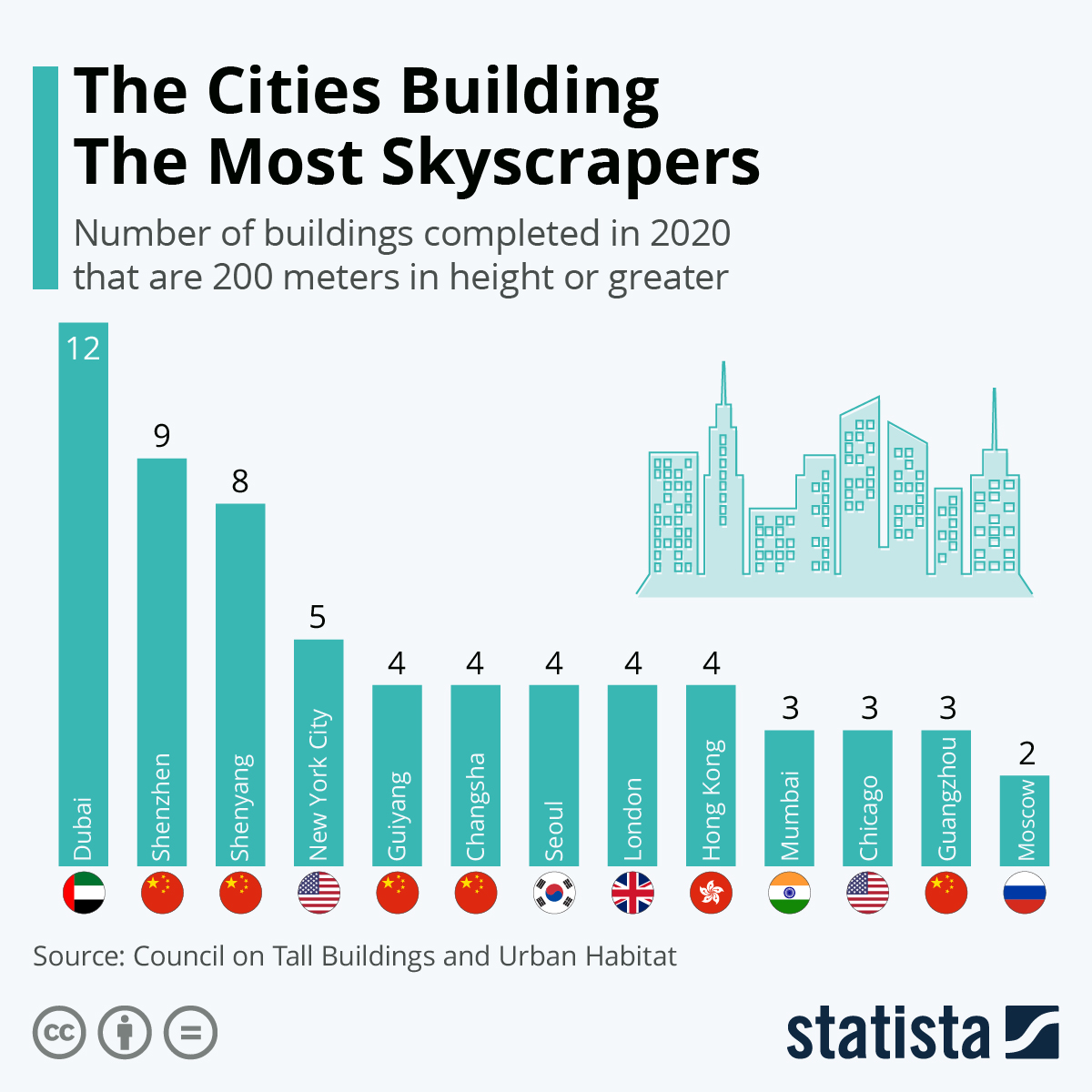 It is estimated that a single city in China built more skyscrapers than the US and Australia combined in 2016. Moreover, despite the disruption caused by the Covid-19 pandemic, China completed 56 buildings 200 meters tall or higher and is at the top of the rankings for the last 25 years, just after Dubai.